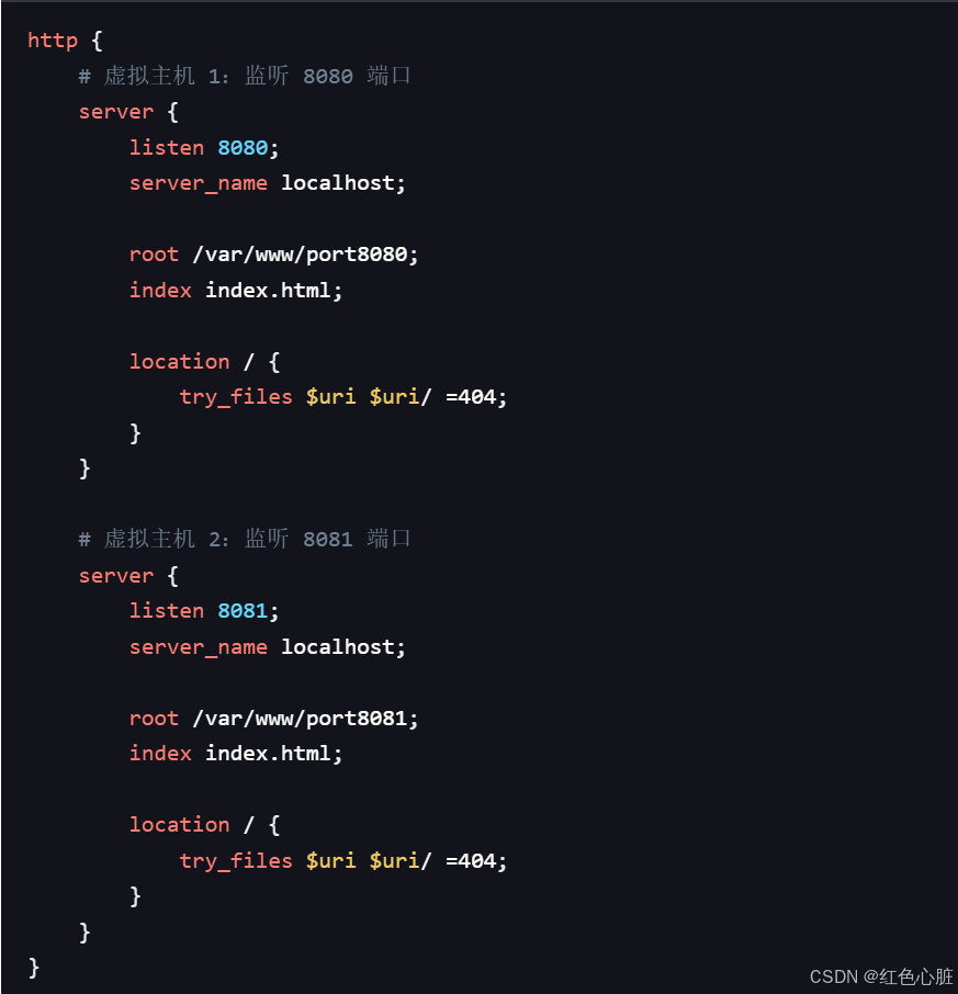 • 第一个虚拟主机监听 8080 端口,网站根目录为 /var/www/port8080 。