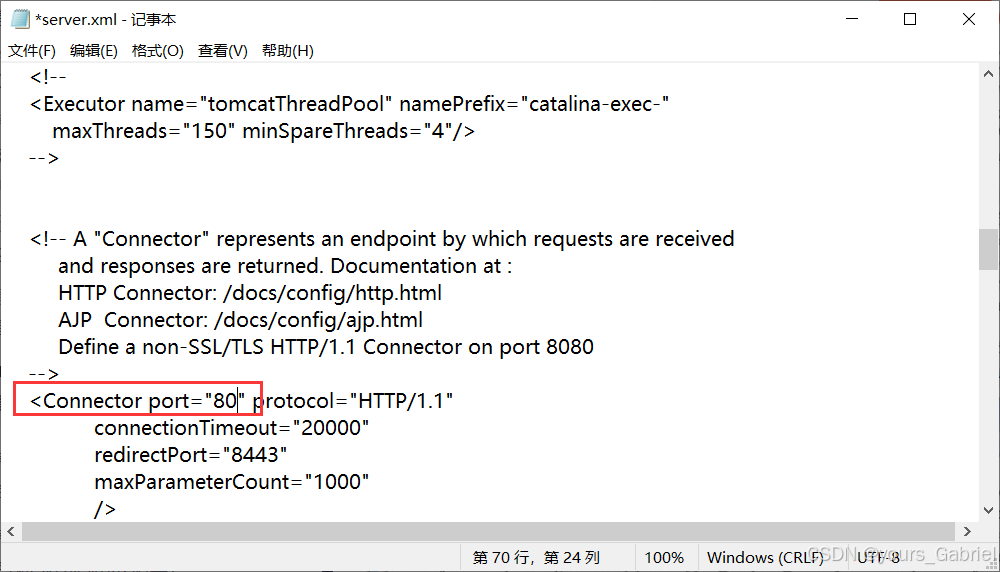 在该tomcat的conf文件下(D:javaSoftwareenvironmentapache-tomcat-10.1.26conf)修改server.xml的端口port为80: