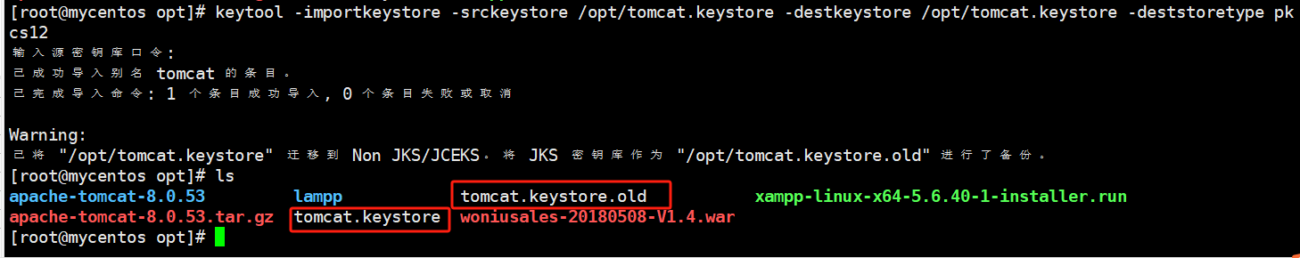 输入密钥库口令: 再次输入新口令: 您的名字与姓氏是什么? [Unknown]: ymq 您的组织单位名称是什么? [Unknown]: youdian 您的组织名称是什么? [Unknown]: youdian 您所在的城市或区域名称是什么? [Unknown]: xian 您所在的省/市/自治区名称是什么? [Unknown]: shanxi 该单位的双字母国家/地区代码是什么? [Unknown]: cn CN=ymq, OU=youdian, O=youdian, L=xian, ST=shanxi, C=cn是否正确? [否]: y 输入 的密钥口令 (如果和密钥库口令相同, 按回车): 再次输入新口令: Warning: JKS 密钥库使用专用格式。建议使用 "keytool -importkeystore -srckeystore /opt/tomcat.keystore -destkeystore /opt/tomcat.keystore -deststoretype pkcs12" 迁移到行业标准格式 PKCS12。