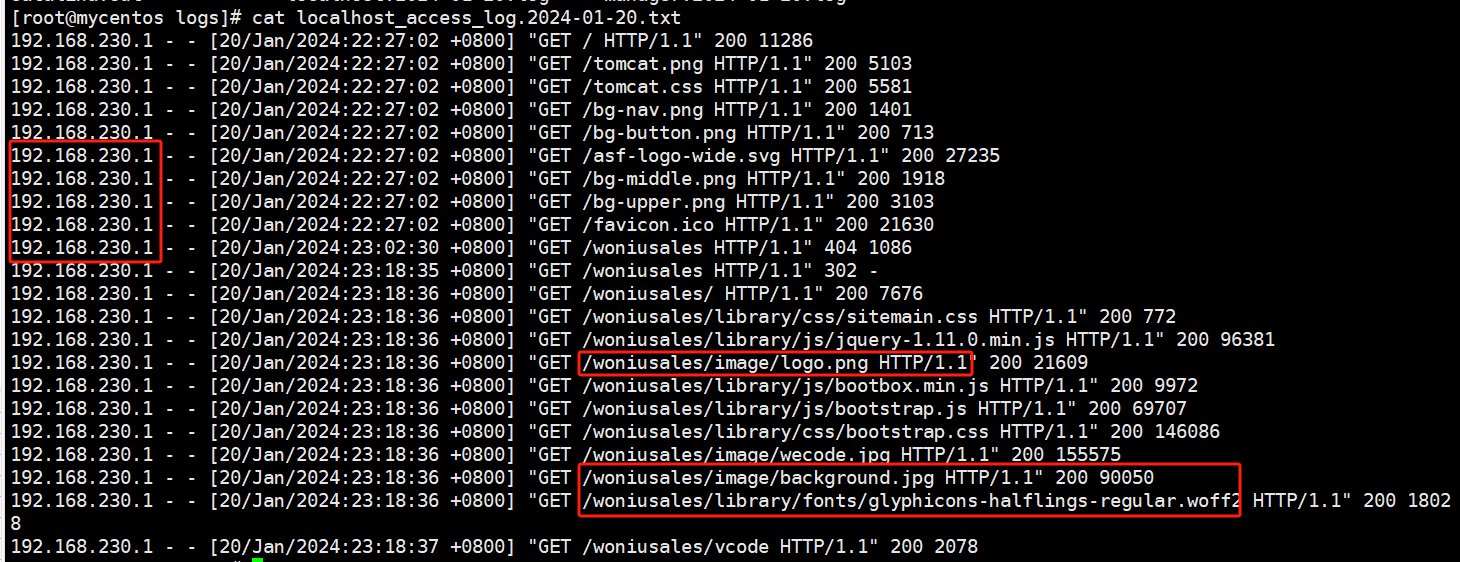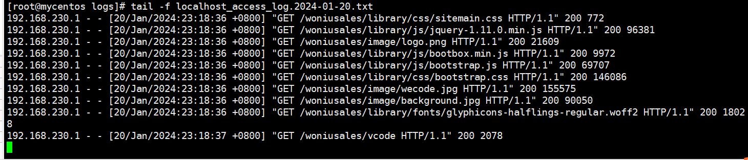 我们可以使用 tail -f localhost_access_log.2024-01-20.txt 来实时观测文件信息变更