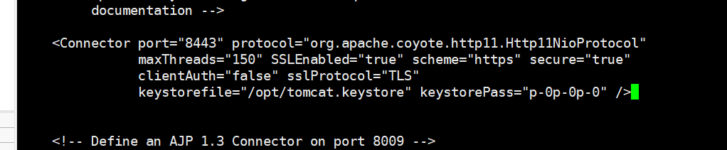 取消https配置的注释,并且在下面添上两个配置 keystorefile="/opt/tomcat.keystore" keystorePass="p-0p-0p-0" 使得完整信息如下