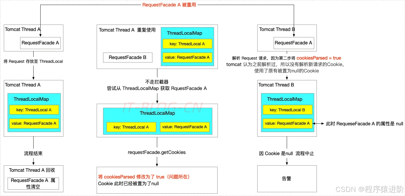 背景:为什么要加Cookie告警:项目出海,需要保证多语言,语言信息从Cookie中获取,所以添加了Cookie告警,告警后发到工作群中,但是相关开发人员告知自己能够正常访问,没有问题,因为正好周五,自己觉得偶发性肯定和并发相关,所以周末研究了下代码,发现和Tomcat Rquest复用机制和ThreadLocal的使用存在缺陷,导致这个偶发性问题