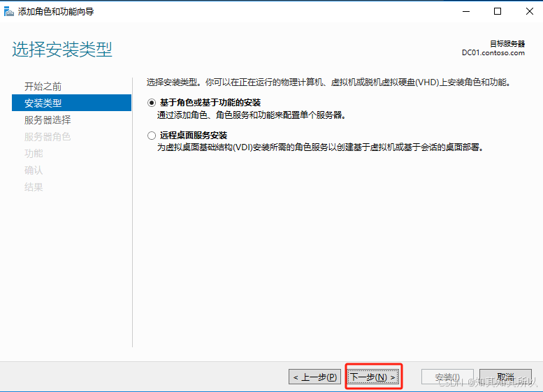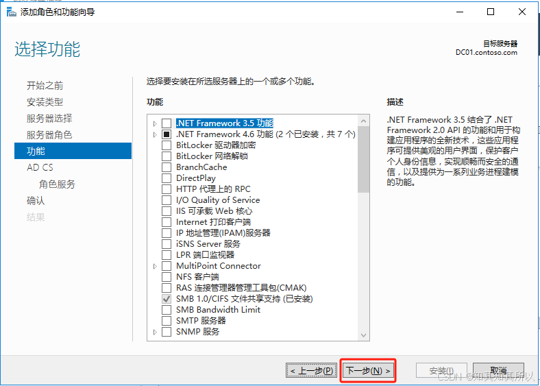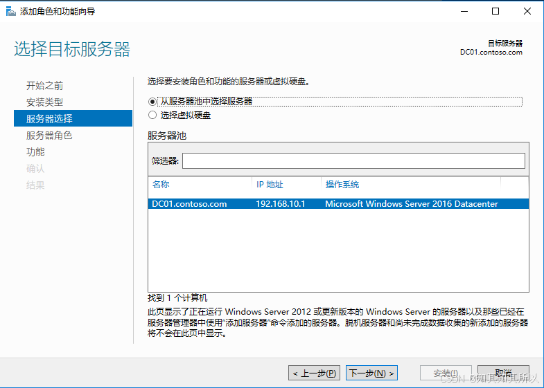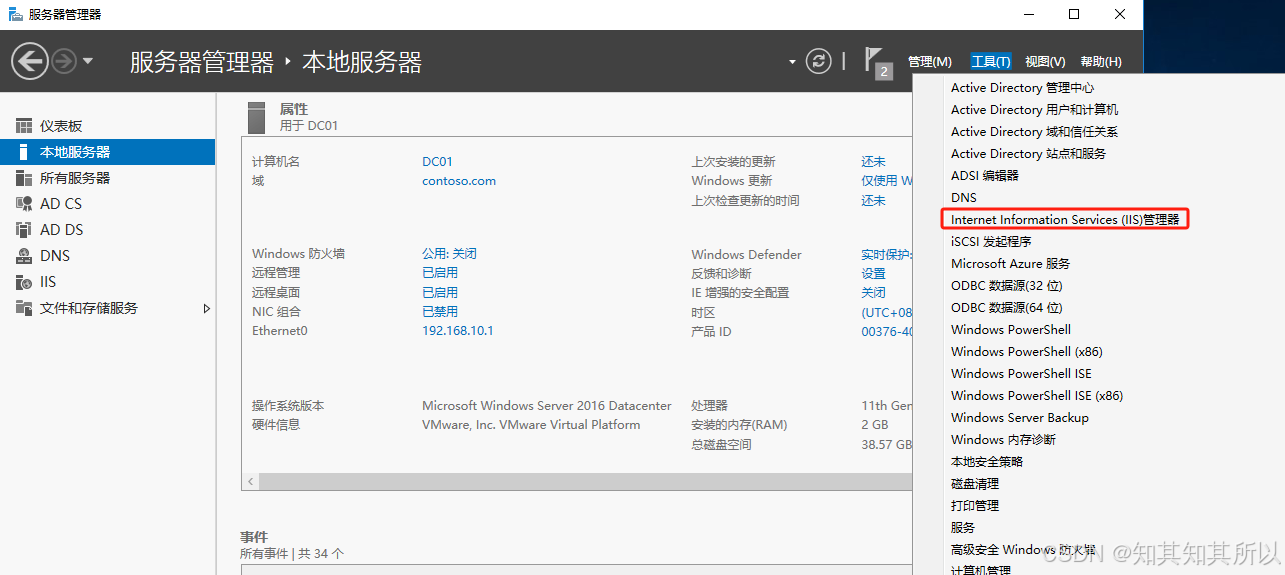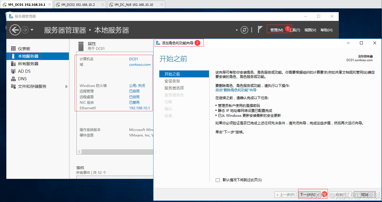 第一台域控制器:DC01 192.168.10.1,Windows Server 2019安装AD域并且提升为域控contoso.com。