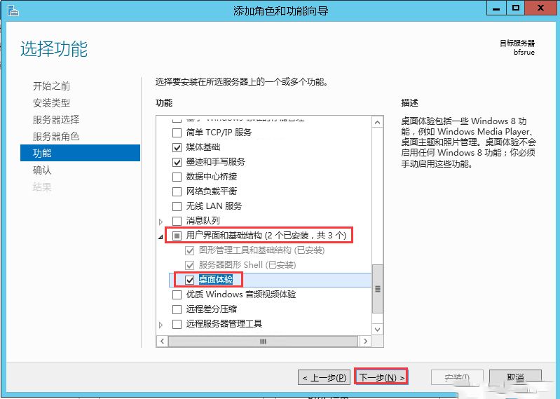 5.在功能界面找到“用户界面和基础结构”,点开该选项,可以看到“桌面体验”并勾选,然后点击“下一步”。