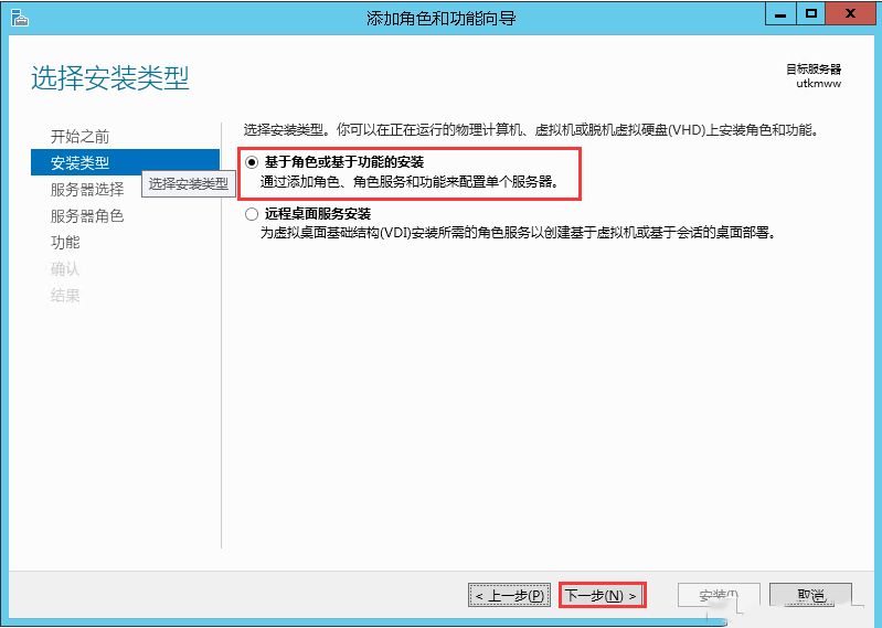 2.选择安装类型,默认“基于角色或基于功能的安装”,点击“下一步”。
