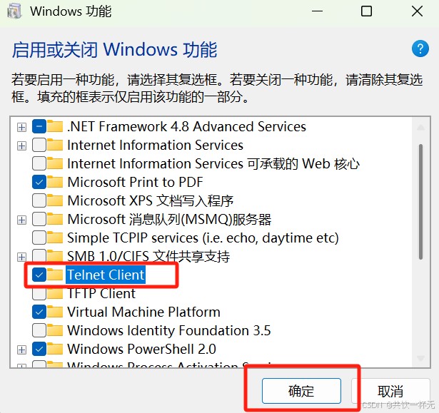- 在 Windows 上,可以通过控制面板的【启用或关闭Windows功能】来安装 Telnet 客户端。