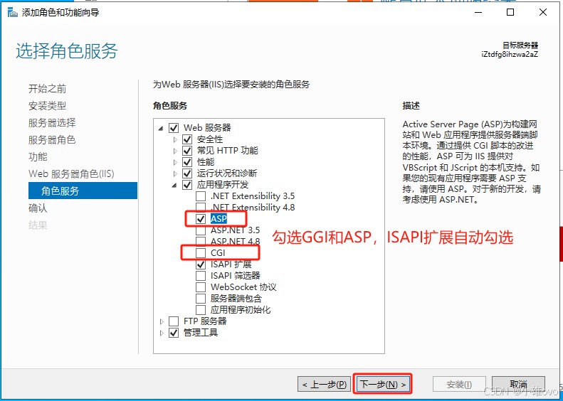 ⑦、角色服务勾选“ASP”、“CGI”、“ISAPI扩展”,单击“下一步”;
