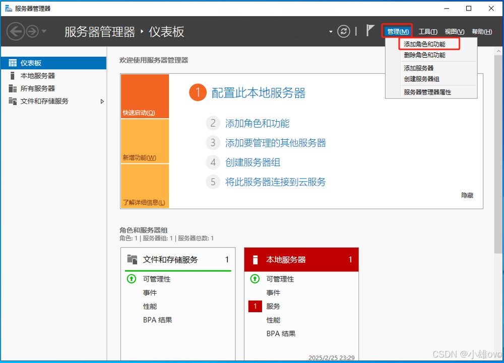 ②、点击右上角的“管理”、“添加角色和功能”;