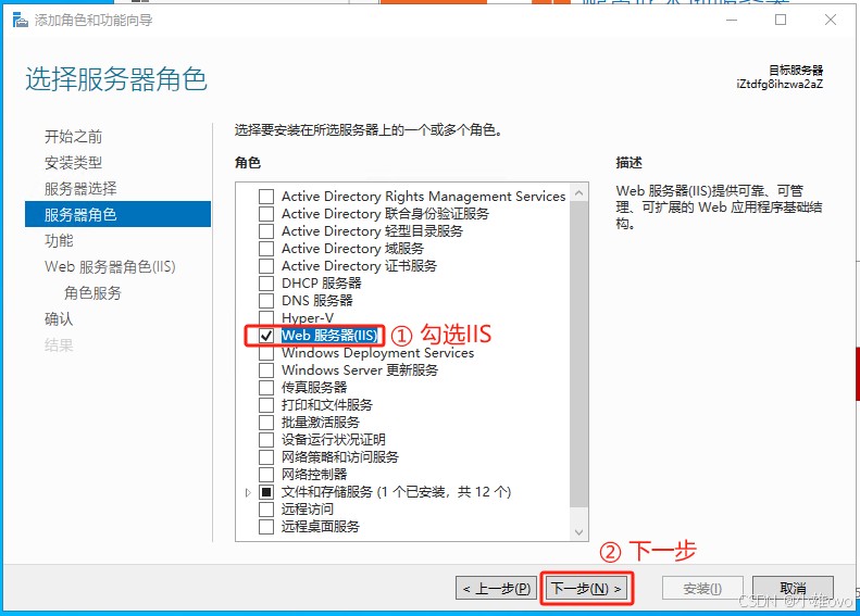 ④、服务器角色勾选“Web 服务器(IIS)”,单击“下一步”;