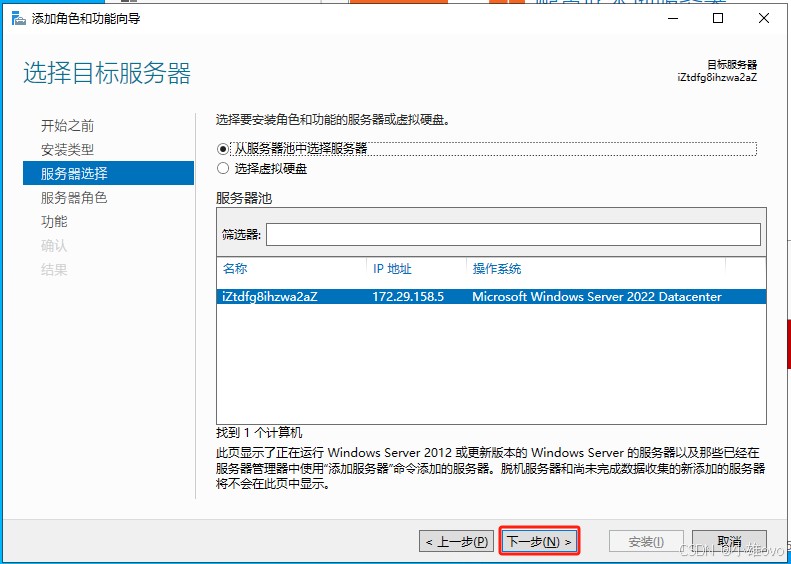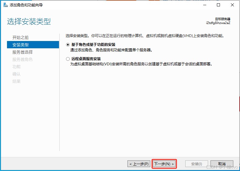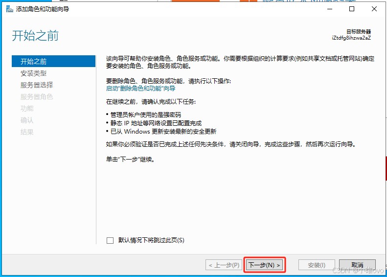 ③、开始之前单击“下一步”,安装类型单击“下一步”,服务器选择单击“下一步”;